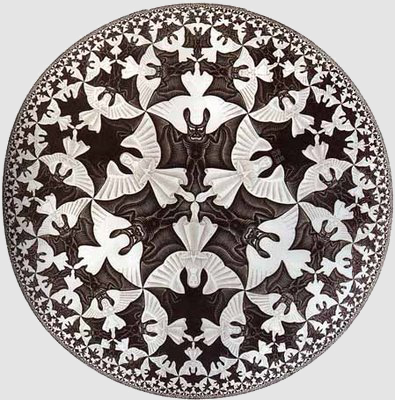 Et donc je vais commencer avec cette merveilleuse illusion par l’artiste hollandais M.C. Escher. Si vous la regardez, et que vous vous concentrez sur les parties blanches, ce que vous voyez, c’est un monde plein