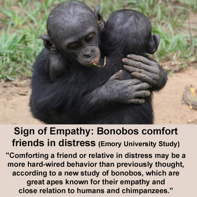 Frans de Waal montre également que de nombreux animaux sont prédisposés à prendre soin les uns des autres, à s’entraider et, dans certains cas, à se mobiliser pour sauver la vie des autres. Bref la possibilité d’empathie (capacité à ressentir les sentiments et les émotions d’autrui, à deviner s’ils sont heureux ou tristes) n’est pas comme on le croyait jusqu’alors le propre de l’homme !