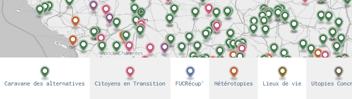 Elle fait converger plusieurs sources pour la plupart citées ici: caravane des alternatives (enfin géolocalisés !), jolies hétérotopies, bases nomades, lieux de resistance, citoyens en transition, lieux de vie, lieux de luttes écologiques et sociales…