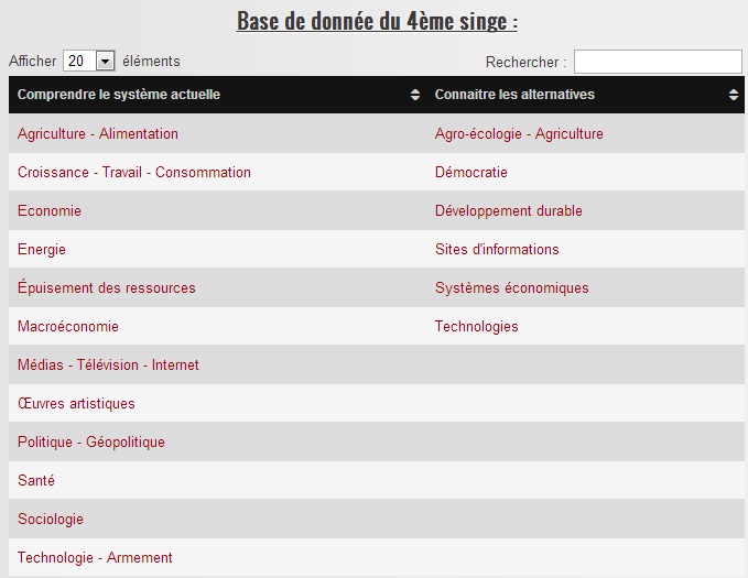 La base de donnée du 4ème singe est accessible sur le menu “Data base” ou via ce lien : https://www.4emesinge.com/il-nest-pire-aveugle-que-celui-qui-ne-veut-pas-voir/base-de-donnee/