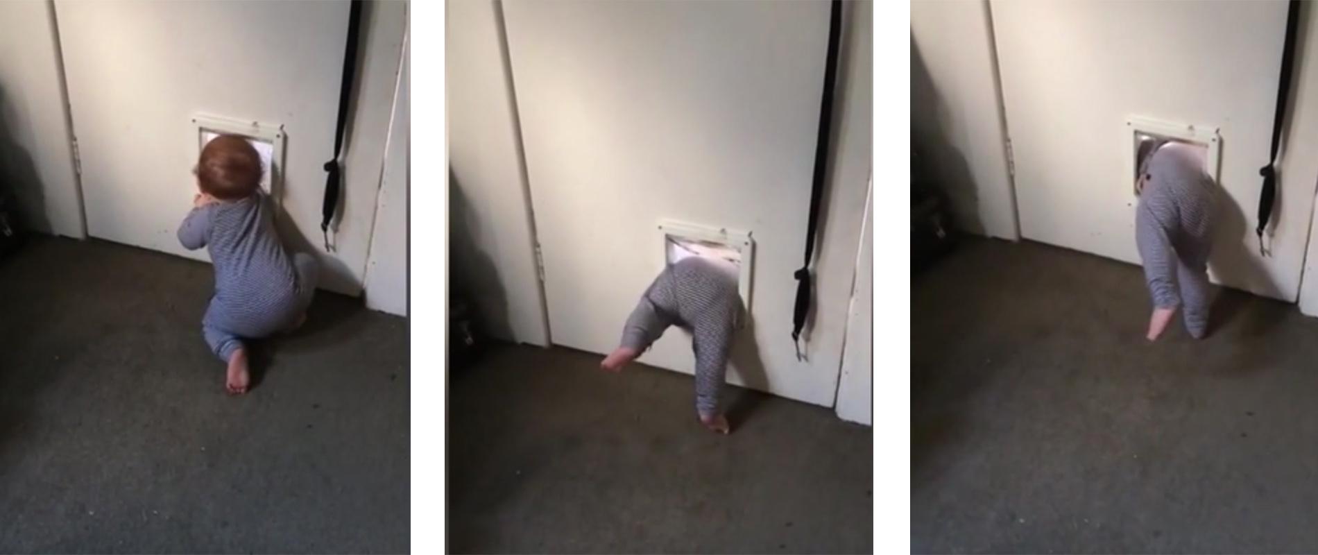 Un bébé néo-zélandais qui s’enfuit de chez ses parents par la chatière. En voilà un qui devrait être “attaché” plus solidement. (Ceci est une blague).