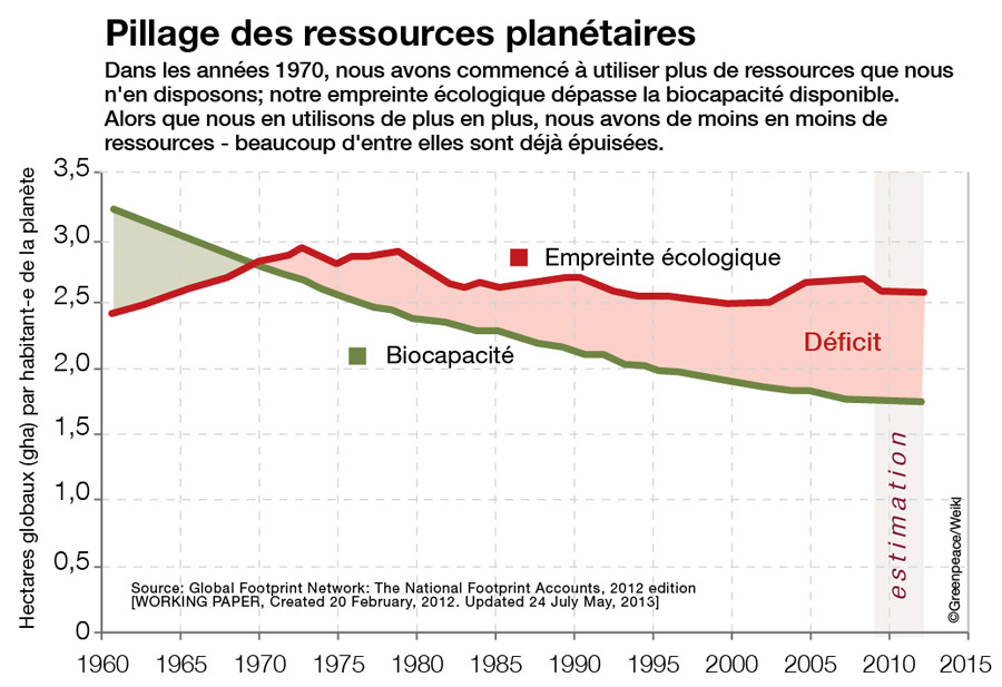Au rythme actuel, le Global Footprint Network évalue que «la demande de l’humanité en ressources et services écologiques exigerait une fois et demie la capacité de la Terre pour être satisfaite». Selon ces mêmes calculs, «nous aurons besoin de deux planètes d’ici 2050 si les tendances actuelles persistent». Si tous les Terriens consommaient comme les Canadiens, il nous faudrait l’équivalent de trois planètes et demie pour assurer notre subsistance.